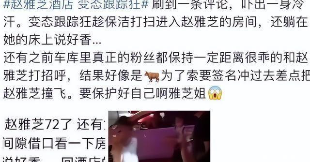 年纪渐长后,身边更需配备足够的安保人员保驾护航。前不久赵雅芝参加活动入住酒店时,就遭遇了私生饭闯入的惊险情况,那位粉丝趁着保洁阿姨打扫房间的间隙偷偷溜了进去,更过分的是,竟擅自跑到赵雅芝的床上,万幸当时房间内无人,否则后果不堪设想,这般无底线的行为着实让人不齿又后怕。真心希望赵雅芝外出时能多安排几位保镖随行,毕竟年纪摆在这儿,身体与安全都容不得半点疏忽,提前做好防护,才能避免意外发生,不至于事后追悔莫及。娱乐圈中每位明星都有着数量庞大的粉丝,其中难免混杂着行为极端的私生饭,唯有多加警惕,才能规避不必要的麻烦。